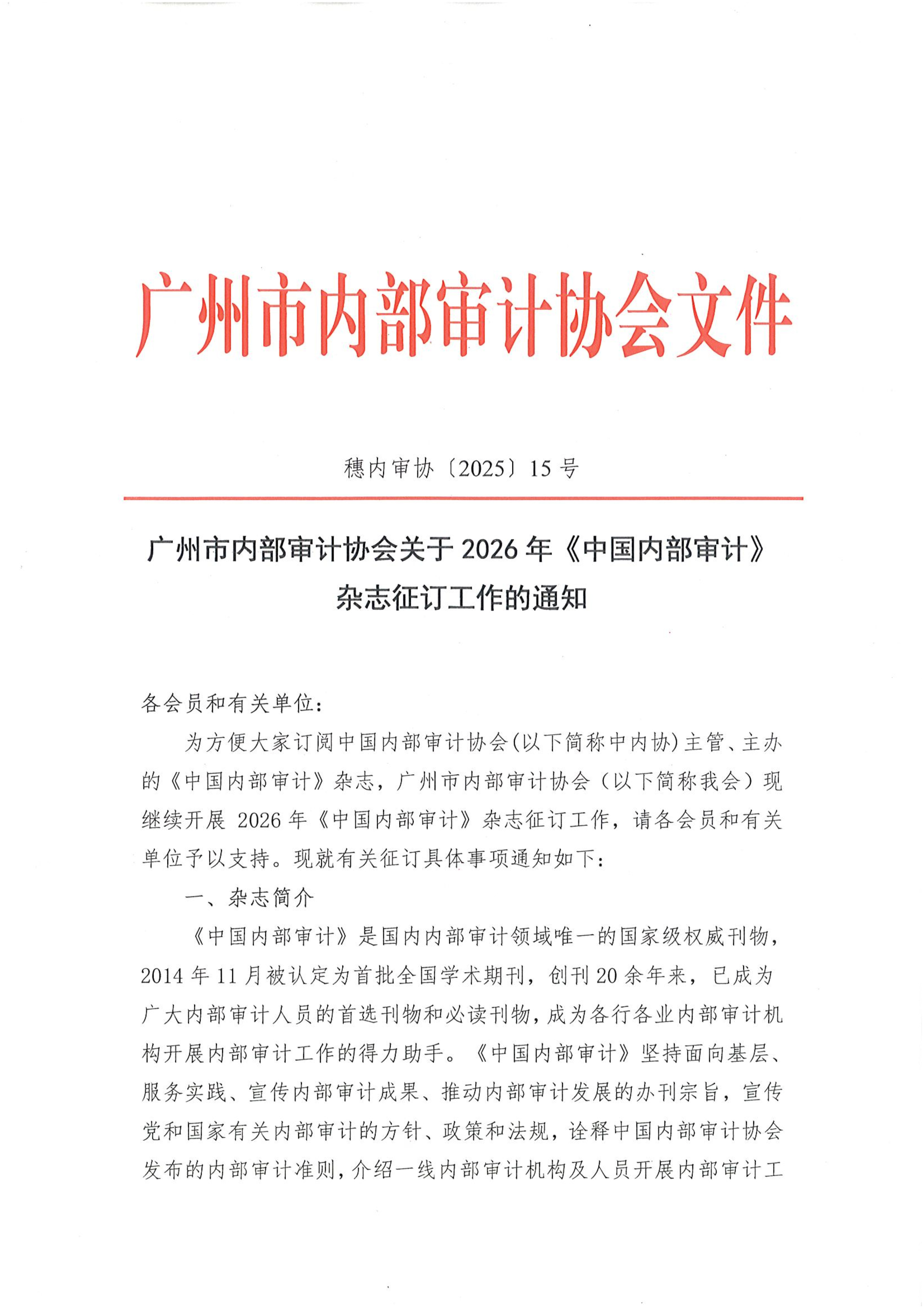 PDF下载:穗内审协〔2025〕15号 关于2026年《中国内部审计》杂志征订工作的通知.pdf